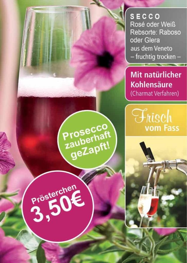 Prickelnder Secco frisch vom Fass. Rosé oder weiss für 3,50€. Geht zum Frühstück und zum Kuchen!
